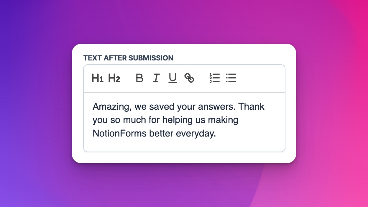 With NotionForms, users have the option to redirect respondents to a URL of their choice upon submission of their form. This feature allows users to seamlessly guide respondents to a specific page or website after completing their form, making it an ideal tool for creating surveys, feedback forms, or any other type of online questionnaire.